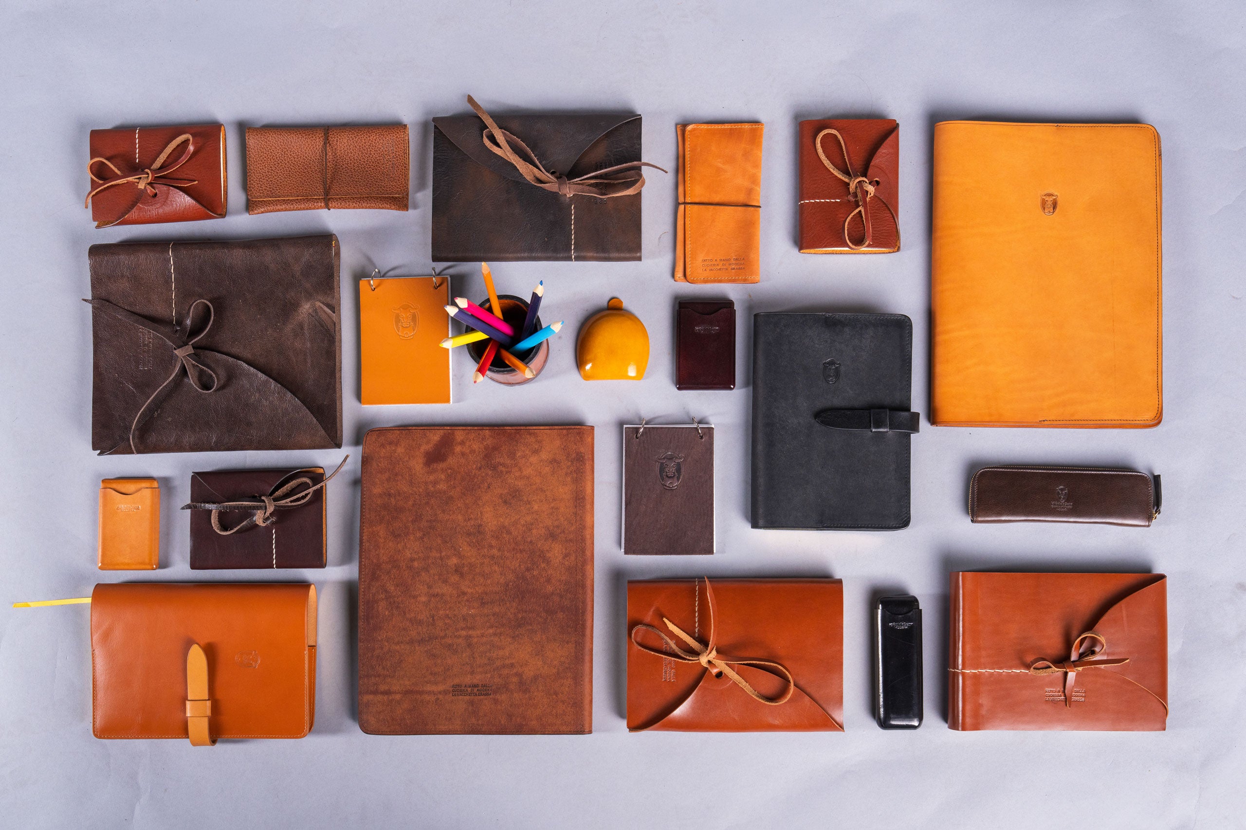 Il tannino, estratto da piante e cortecce, dona al cuoio calore, carattere e la capacità di migliorare con il tempo: ogni pezzo diventa unico, vivo, personale.